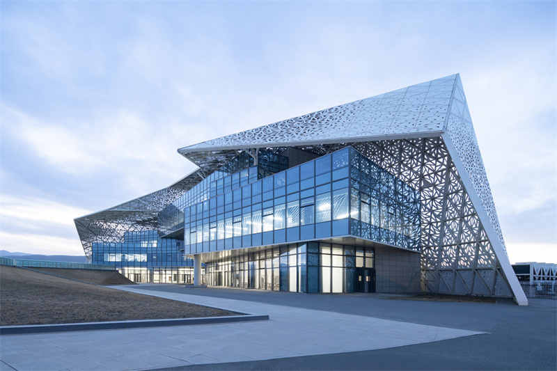 在設計過程中,設計團隊深度融合“生態”與“創新”理念,將全生命周期綠色低碳理念貫穿始終,在場地規劃、空間營造、技術整合與材料應用等方面實現了系統性創新突破。建筑布局緊密貼合榆中當地氣候與地形特征,充分運用被動式設計策略,最大程度利用自然采光與通風,有效降低建筑運行能耗。技術應用上,項目集成高效地源熱泵系統、建筑光伏一體化(BIPV)技術、智能能源管理與雨水回收利用系統等,構建起高效循環的資源利用體系。材料選擇方面,大量采用本地化、可再生及低碳建材,融入具有甘肅地域文化特色的生態景觀設計,使科創中心成為與周邊自然環境和諧共生、彰顯隴原風貌的綠色建筑典范。