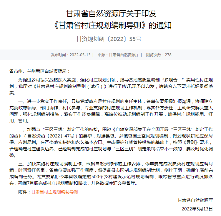 2022年3月以來,在全面總結我省村莊規劃編制經驗的基礎上,省自然資源廳組織規劃設計院等14家規劃研究機構,堅持“整體穩定、局部微調、完善提升”的原則,對《甘肅省村莊規劃編制導則(試行)》進行了修訂,重點將《導則》試行以來國家、我省對村莊規劃編制的新要求、新政策,以及村莊規劃試點工作中值得推廣的經驗方法融入其中,指導地方精準化編規劃、差異化編規劃、用管結合編規劃、多方參與編規劃、精簡結合編制規劃。